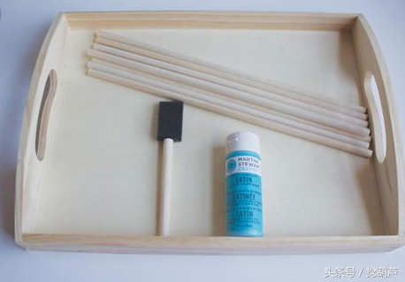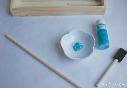 第一步:准备好泡沫刷、蓝色颜料、木托盘、木棍、木胶。