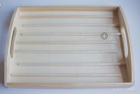 制作材料:泡沫刷、蓝色颜料、木托盘、木棍、木胶、木锯、五颗大理石珠子
