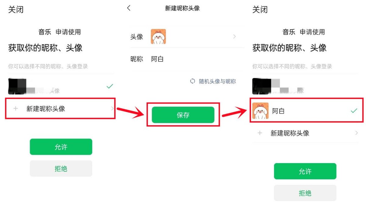 步骤:在“授权允许”界面→【新建昵称头像】→保存→选择“新建的头像与昵称”→【允许】即可登录。