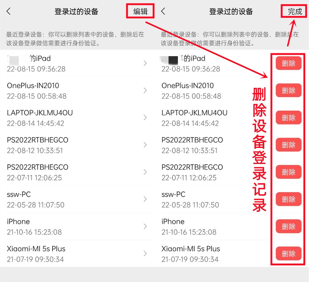 步骤:【设置】→【账号与安全】→【登录过的设备】→【编辑】→【删除】设备登录记录→【完成】