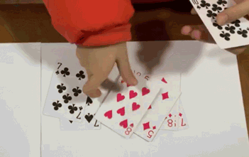 让孩子把打乱的扑克牌按数字、颜色和花色分类。