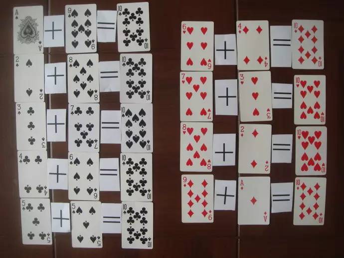 两人平均分牌,一方先出牌,另一方出的牌必须和对方出的牌加起来是10。轮流先出牌,赢的收牌,最后比谁手上收的牌多。