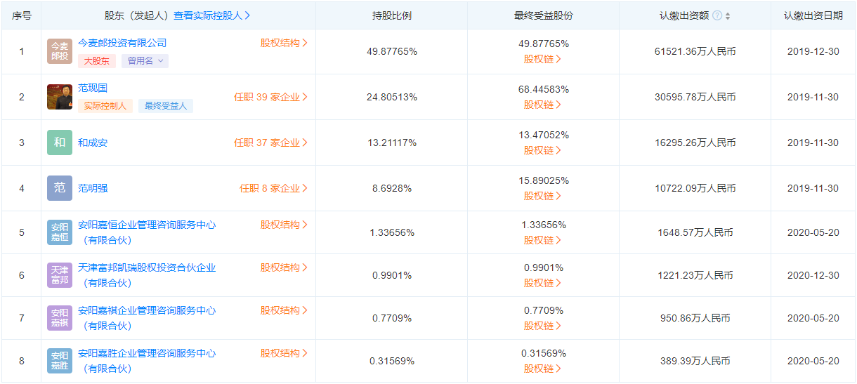今麦郎投资有限公司的第一大股东是范现国,持股比例为86.32%,范明强持股13.68%,范现国是范明强的父亲,河北邢台人。所以通过股权穿透之后发现,今麦郎的第一大股东是范现国,最终收益股份为68.44%,而且范现国是今麦郎公司的创始人、董事长。