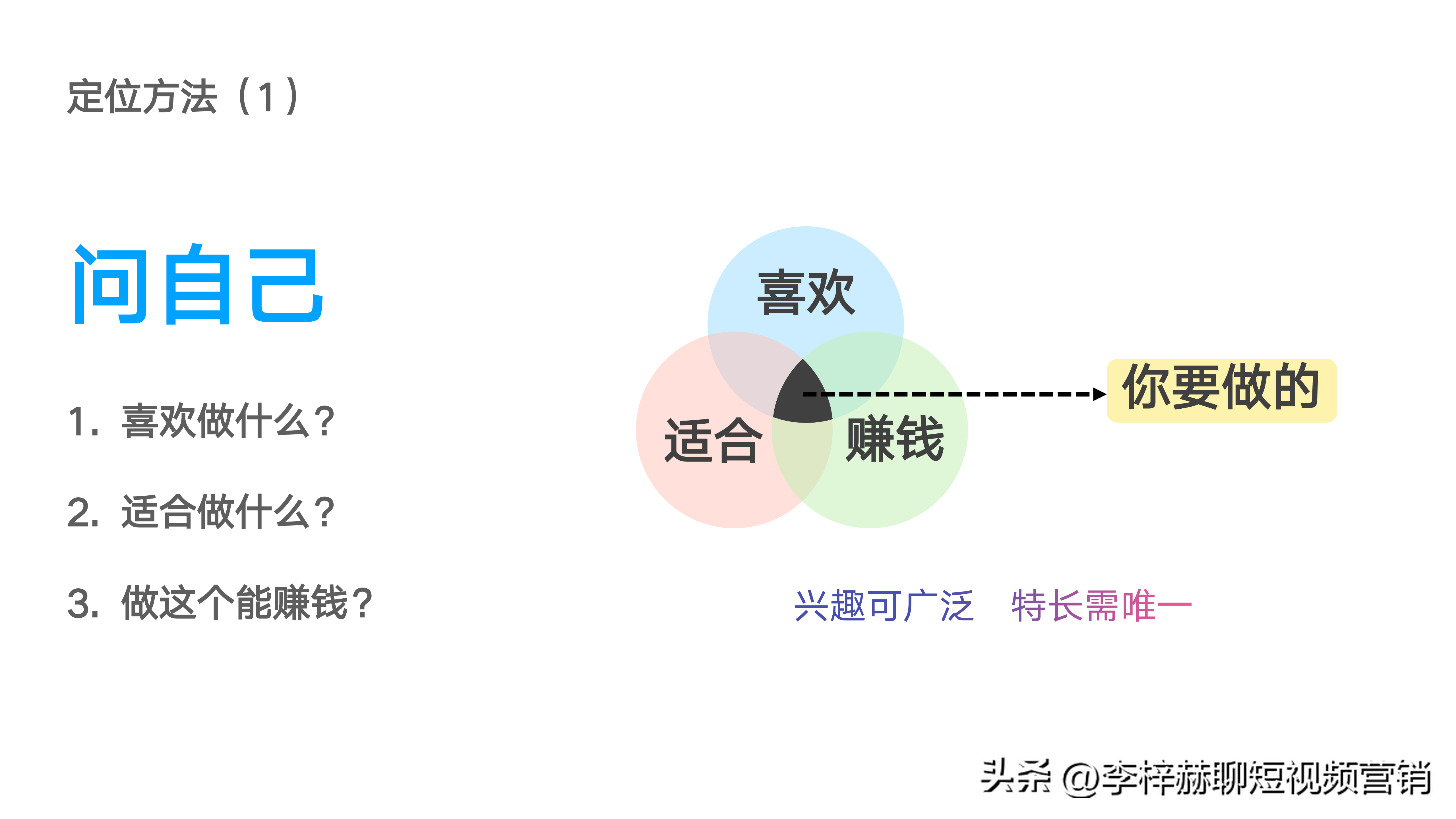 在这里给各位分享一个定位的方法,我叫三个圈定位法。在纸上画上三个圈,第一个圈,叫做我喜欢。第二个圈,叫我适合。第三个圈,叫做能赚钱。三个圈重合的部分就是你要做的事情。