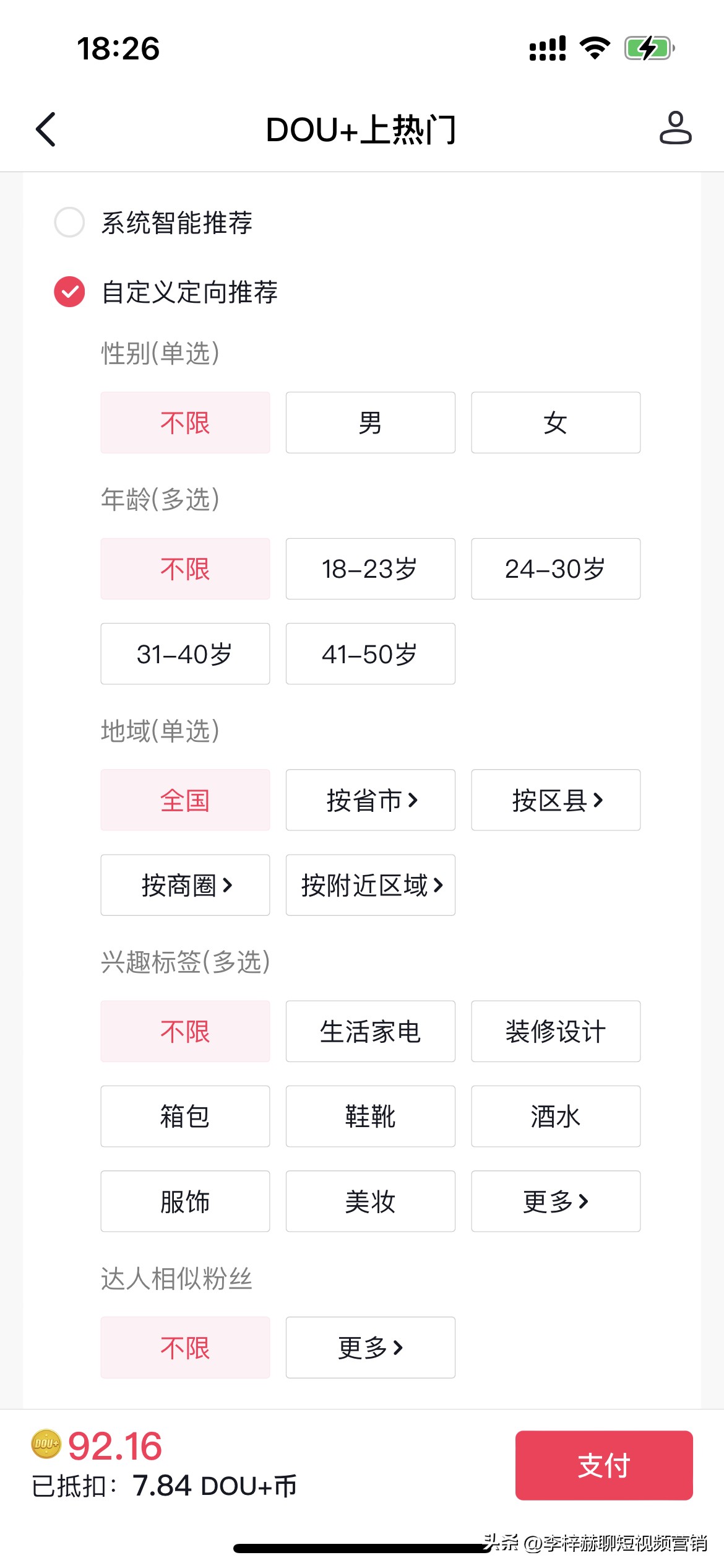 2. 投放方式有三种,系统智能投放、自定义定向投放、达人相似粉丝投放。建议大家第一次投放系统智能投放,有时候大数据算法更精准。到后面可以尝试定向投放和达人相似粉丝投放。最终选择哪种投放方式,要通过测试做选择。