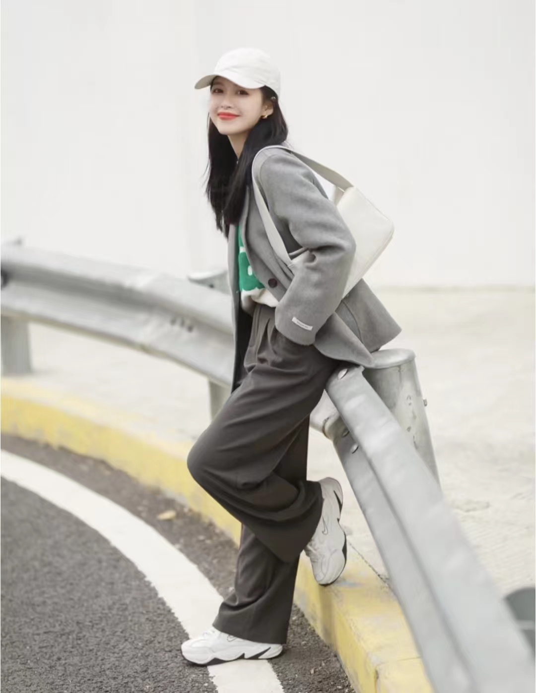 浅灰色澳洲西羊绒西装+深灰色西裤加韩系厚底休闲鞋,标准的韩系穿搭没错了,内搭是米白色绿色字母毛衣,带上米色系棒球帽随性街头感满满了。