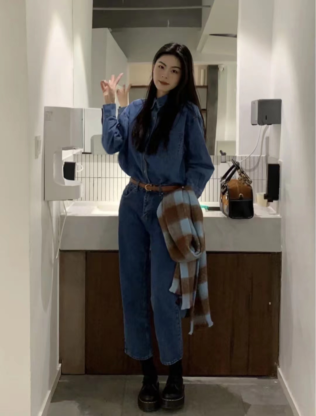 太爱牛仔套装了,百穿不厌又经典时髦,衣服颜色是很复古的蓝色,衬衫可以直接塞进直筒裤里穿,很显身材比例,牛仔叠穿黑色大衣也超好看!