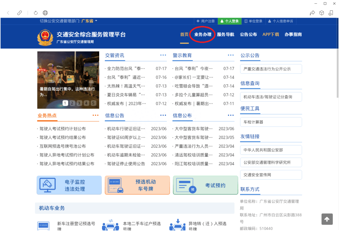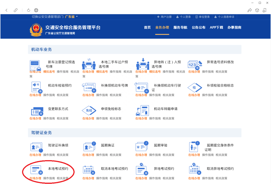 登录交通安全综合服务管理平台(gd.122.gov.cn)→【业务办理】→【驾驶证业务】→【本地考试预约】