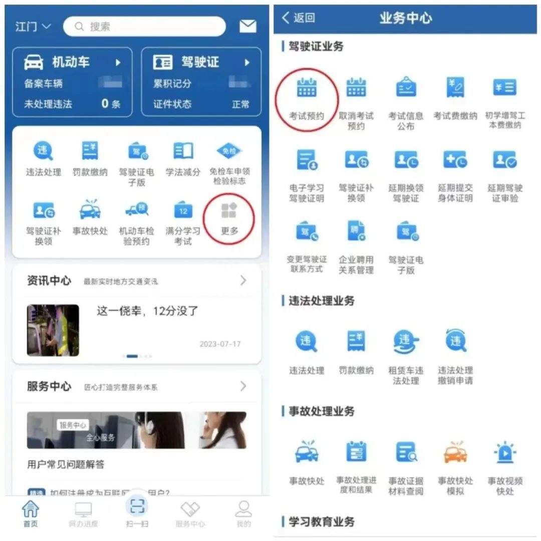打开“交管12123”首页→【更多】→【驾驶证业务】→【考试预约】
