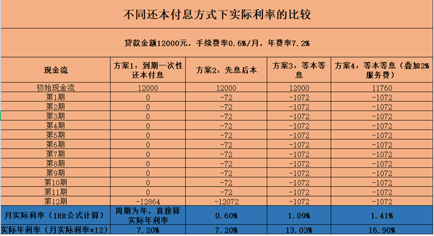 你是不是以为年费率=0.6%*12=7.2%,但这笔分期的实际年利率为13.03%,若叠加2%的服务费,实际年利率可以高达16.9%。对同一笔贷款采用不同的还本付息方式,实际利率差别是很大的,从计算结果来看,到期一次性还本付息、先息后本方式下实际年利率与名义利率是一致的,等本等息方式下实际年利率是明显高于到期一次性还本付息、先息后本方式,若是叠加服务费就更高了。