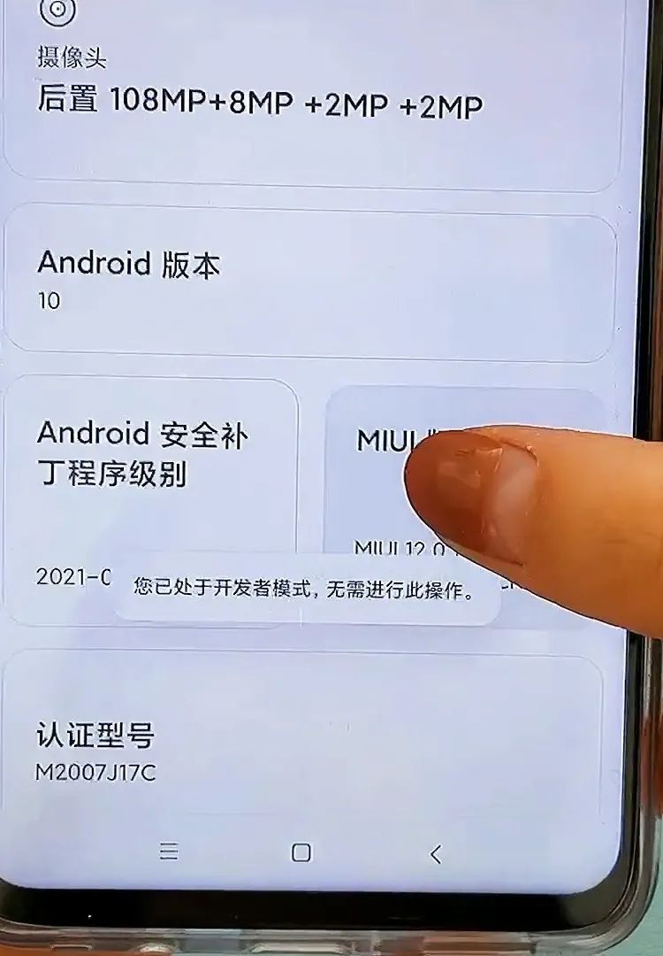 然后我们连续点5下,然后他就会说你已经处于开发者模式了,无需再进行操作,但如果你是其他安卓手机,在系统和更新里面找到你的版本号,然后也是连续的。点击5下或者7下,然后也会出现你已经处于开发者模式了: