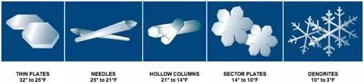 雪晶根据云的温度和湿度生长出著名的不同形状(详情见下图)。当它们穿过云层落下时,会聚集越来越多的冰粒,当结晶般的细雨演变成暴风雪时,它们往往会聚集在一起。当这些掉落的晶体离开云的底部时,它们通常已经成长为我们称之为“雪花”的复杂的格子状星暴。