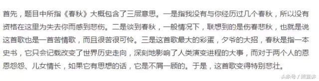 的确,表面上这又是一首林夕走心诉苦的备胎情歌。但经典的备胎情歌如“男不听《七友》,女不听《钟无艳》”,都只是用童话人物、历史人物来借喻爱情。而《春秋》原意是指孔子撰写春秋时期大事的儒家经书,是中国现存最早的一部编年体史书。这么一个体量宏大的意象,用来说儿女情长的二三事,其实是很有难度的,搞得不好就会给人言之无物的空洞感。而《春秋》同样是表达“爱又得不到”的主题,能让人听完后深感震撼,以至于有人说“惨到惨绝人寰”的地步,歌词含义的深度与厚度是加了很多分的。