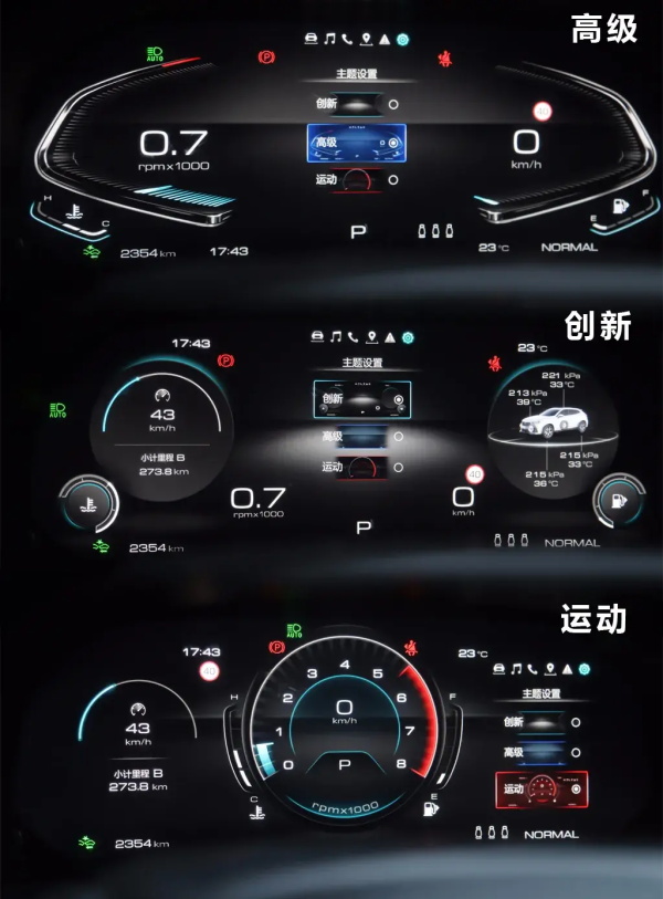 12.3英寸全液晶仪表盘显示效果清晰,界面设计也简洁大方。这套仪表盘有高级、创新和运动三个主题样式,用户可以根据喜好自行选择。功能方面,VV7科技版的仪表盘可显示的信息也很全面,包括油耗、自适应巡航、多媒体、导航等,可参考性很高。