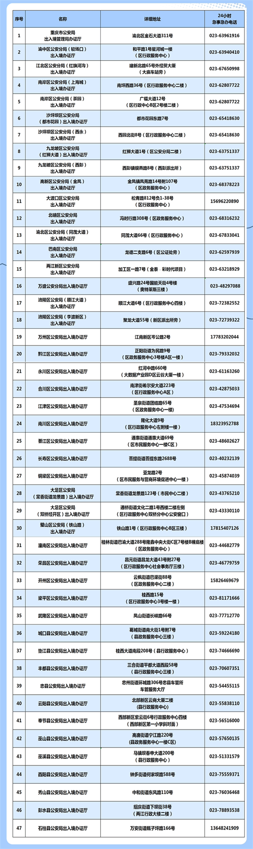出入境管理局已在“重庆公安出入境”微信公众号更新了每个出入境办证大厅的详细地址、办证时间、咨询电话、24小时急事急办电话等,方便市民就近办理。