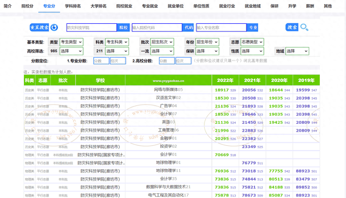 学校现在有35个本科专业,一个服务国家特殊需求硕士人才培养项目。在高考中,防灾科技学院在河北省物理类本科批的高考录取分数线为497分,历史类的高考录取分数线为522分,国家专项计划招生的专业高考录取分数线为518分。