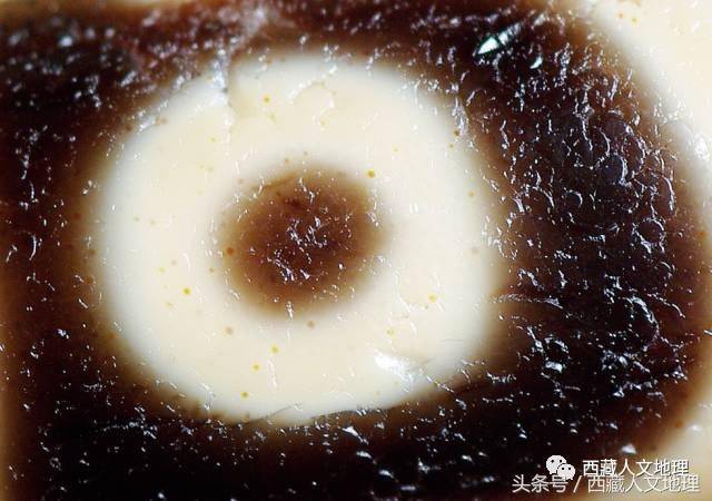 2、光泽:天珠表面由于年代久远而且经过佩戴,就会形成一种光亮的表层,用肉眼观察表面似涂一层油脂,这种天珠有一种玉质的感受。有些天珠经过火烘,表面呈现灰白色。