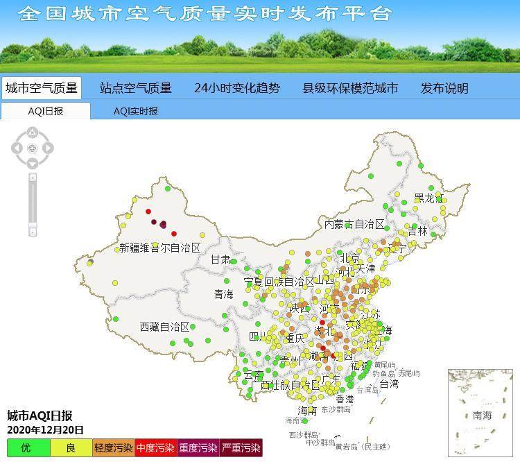 中国环境监测总站网查看到的2020年12月20日城市AQI日报, 大部分是优、良、轻度污染。