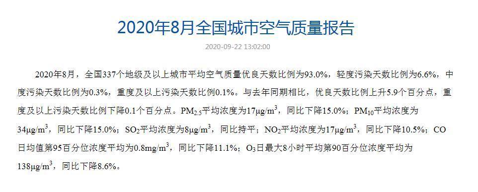 中国环境监测总站网查看到的关于2020年8月全国城市空气质量报告,总体看 空气质量是变好的