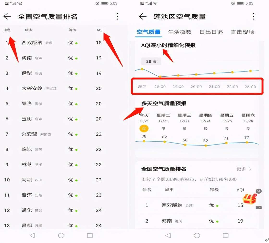 城市空气质量的排名,还可以查看每小时空气质量的预报,以及逐天的空气质量预报