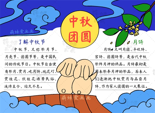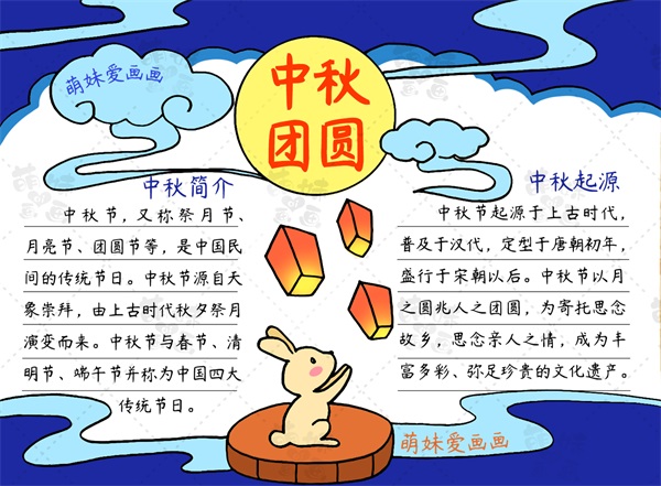 中秋节是中国民间的传统节日,这一天,我们和家人团聚在一起,吃月饼、赏月。今天萌妹老师给大家带来一组含文字内容的中秋节手抄报和简笔画合集,简单又漂亮,可收藏备用哦。