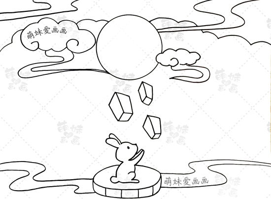 一、我们用一些云彩、玉兔、月饼、月亮等元素绘出手抄报线稿。