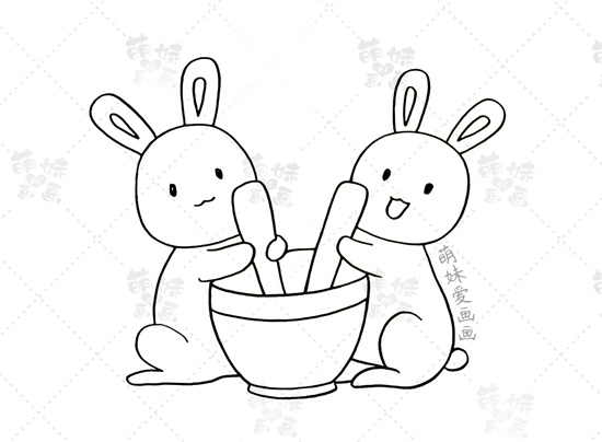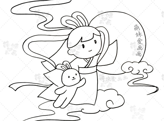 一、首先,我们用云朵、桂花树、玉兔、月亮等元素绘制出黑白线稿。