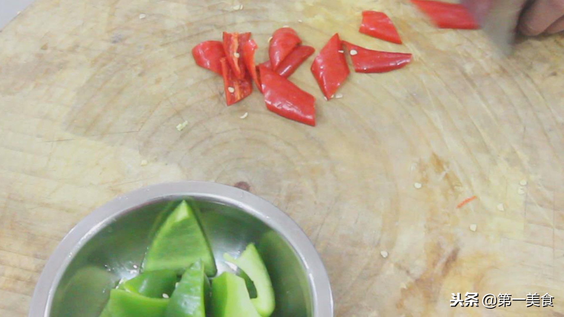 在等待的过程,取青柿子椒半个,切成三角片,红尖椒两个,切成片。
