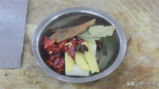 大葱白切四小段,轻轻用刀拍扁。料盆放入大茴(八角)一个,花椒一小把,红干椒一小把,香叶两片,桂皮一片。