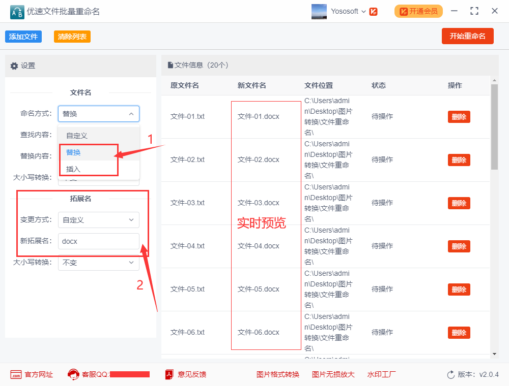 第二,导入好文件后左边会出现设置窗口,文件的命名方式选择“替换”或“插入”,随后进行拓展名设置,变更方式选择“自定义”,然后在下面输入新的文件扩展名。在软件右边可以对新文件名实时预览。