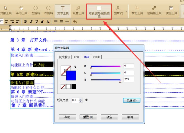 如需修改文字或者文本框,形状等跟颜色相关的操作,可以选择“对象填充/线条颜色”工具后在色板中更换其他颜色。