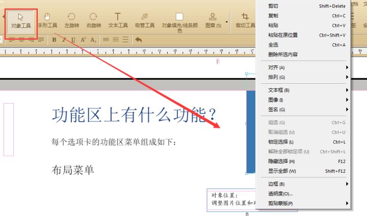 选择菜单栏中的“对象工具”后则可对PDF文档中的图片或文本框等对象进行相应的修改或者删除操作。