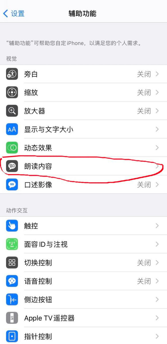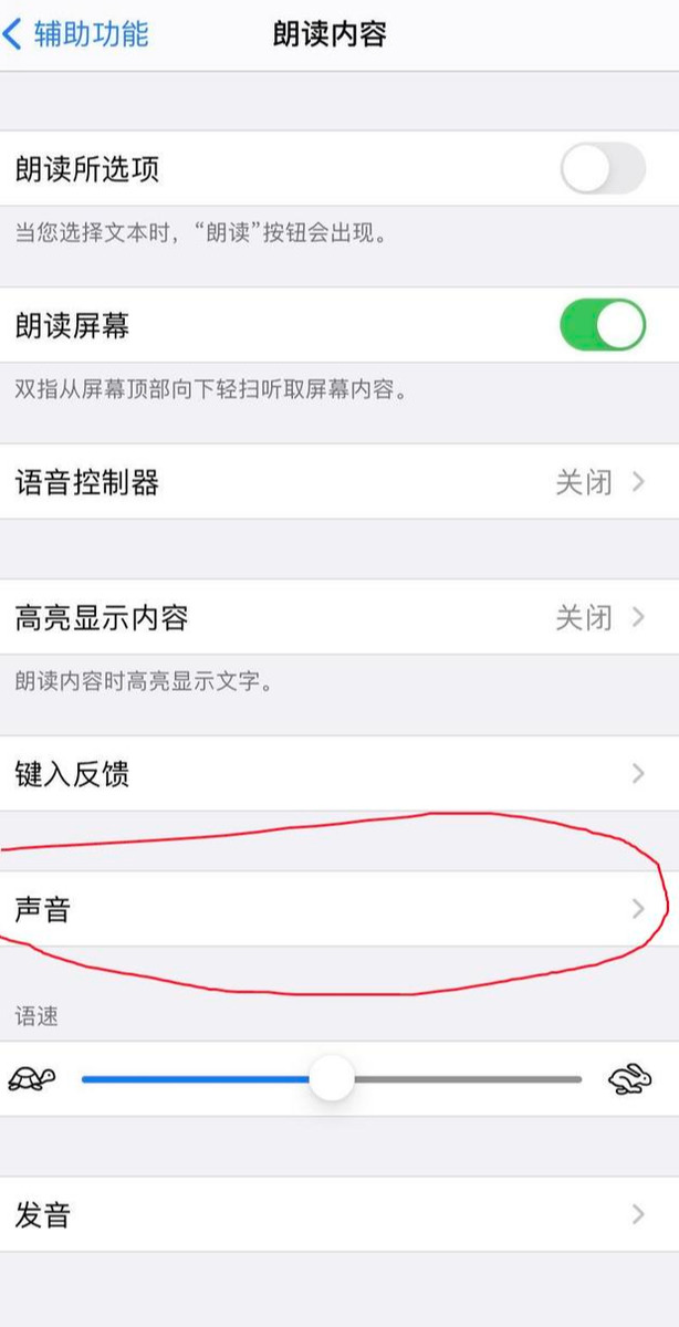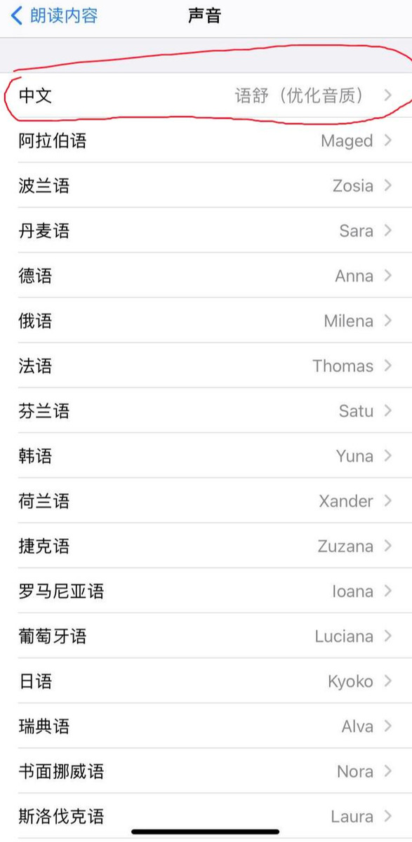 方法很简单,首先进入设置-通用-辅助功能,然后进入朗读内容-声音-中文,如下图红圈处所示: