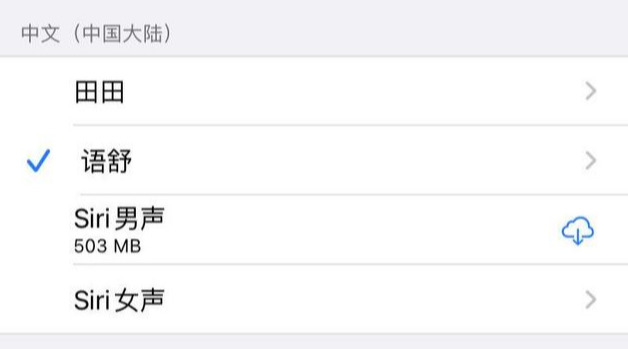 这时候你可以看到中文(中国大陆)选项下方有4种声音,分别是田田、语舒、Siri男声和Siri女声。