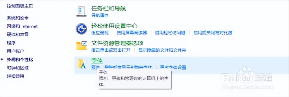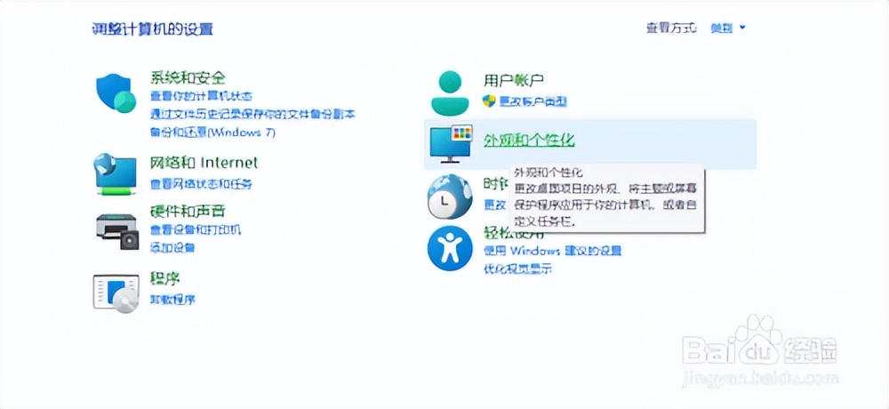 2、打开“控制面板”并进入“外观和个性化”选项。