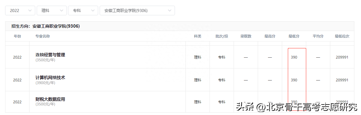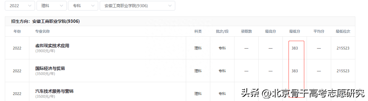 2022年安徽工商职业技术学院安徽省专科批理科最低分专业(部分)录取分数线