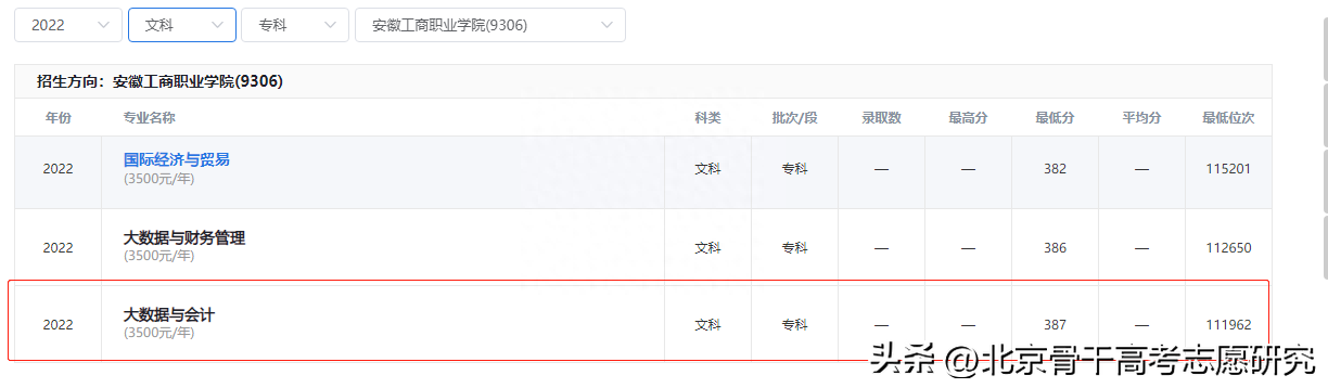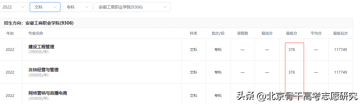 2022年安徽工商职业技术学院安徽省专科批文科最低分专业(部分)录取分数线