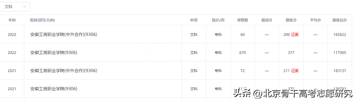 2021-2022年安徽工商职业技术学院安徽省专科批文科录取分数线