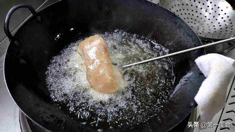 3.锅内烧油,油温升至五成热时,把五花肉放入锅中,盖上锅盖防止热油贱出烫伤,保持中小火炸2分钟,经常给五花肉翻面,让五花肉均匀受热。五花肉炸成两面金黄时捞出,放入清水中过凉,晾至不烫手时取出,改刀切成均匀小块。
