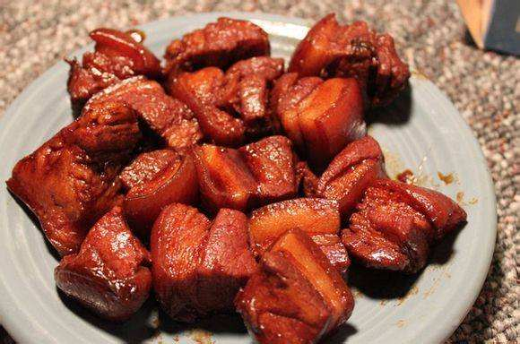 食品用料五花肉600g,清油250g,八角25g,桂皮15g,小茴15~25g,甘草10g,三奈10g,甘菘3~5g,花椒20g,砂仁10g,草豆蔻5g,草果15g,丁香5~15g,生姜100g,大葱150g,绍酒100g,酱油100~200g,冰糖350~500g,味精15g,精盐350~500g,鲜汤5000g,纱布袋2个。卤药包配方:八角、桂皮、小茴、甘草、三奈、甘菘、花椒、砂仁、草豆蔻、草果、丁香。