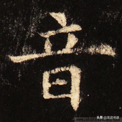 上部“立”旁呈扁三角形,整体抗肩。首笔右点居中,稍重;短横露锋入笔,抗肩,稍压首点而过,勿长;中间点、撇整体稍偏左,紧凑呼应,角度稍立;长横起笔左探,抗肩比短横略小,中间稍细,略呈拱形,收笔稍下拉。
