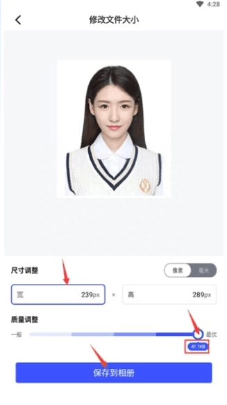 2、接着进去之后,选择添加照片,然后对照片的长和款进行调整,还有画面质量也可以拉动修改,最后完成后点击【保存到相册】就完成了。