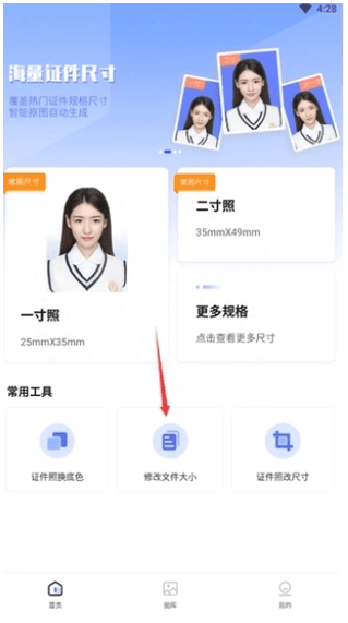 1、这是款专业的证件照软件,我们也可以在上面进行修改照片的大小,打开软件,在主页的底部,常用工具里,选择【修改文件大小】。