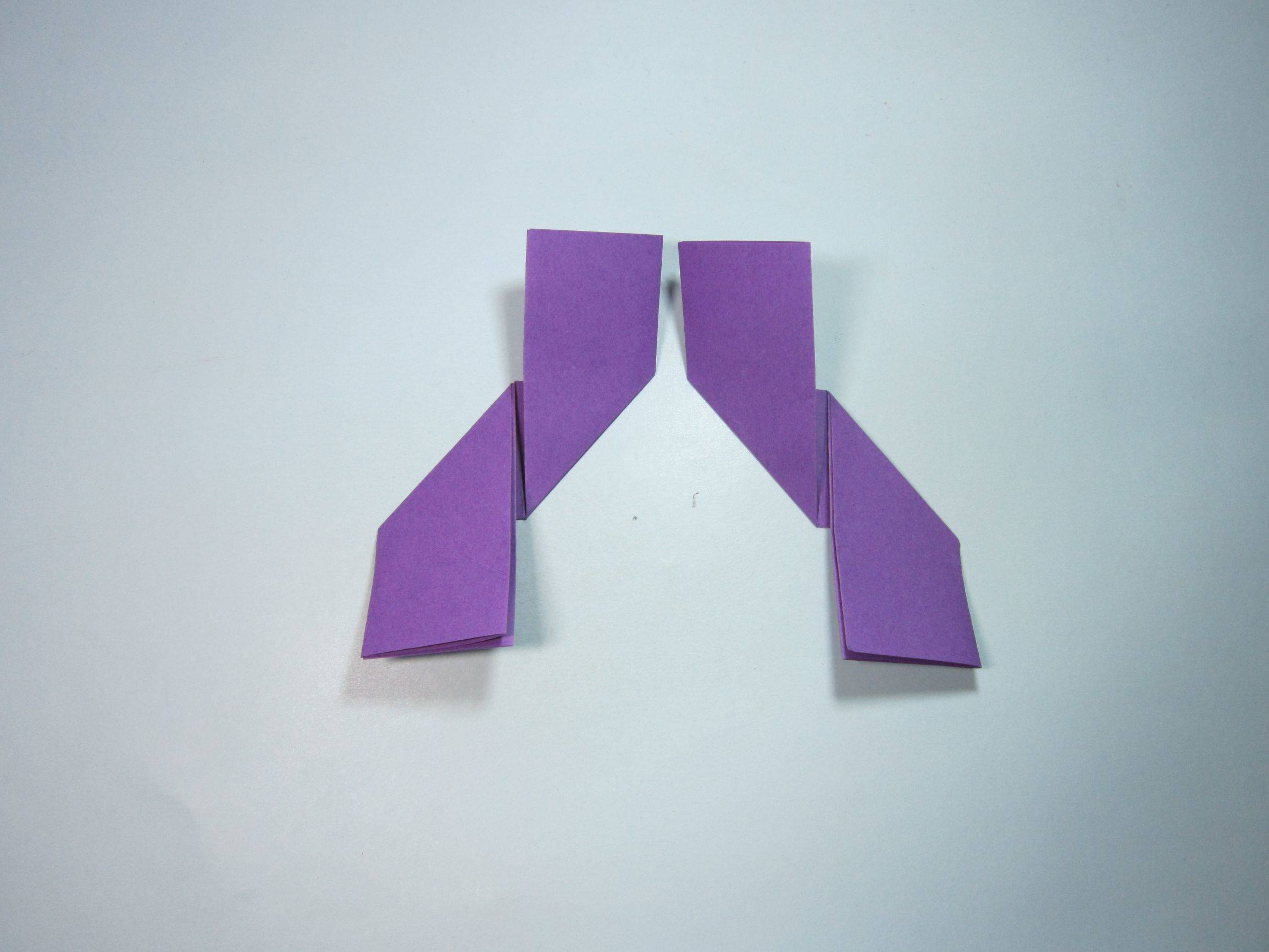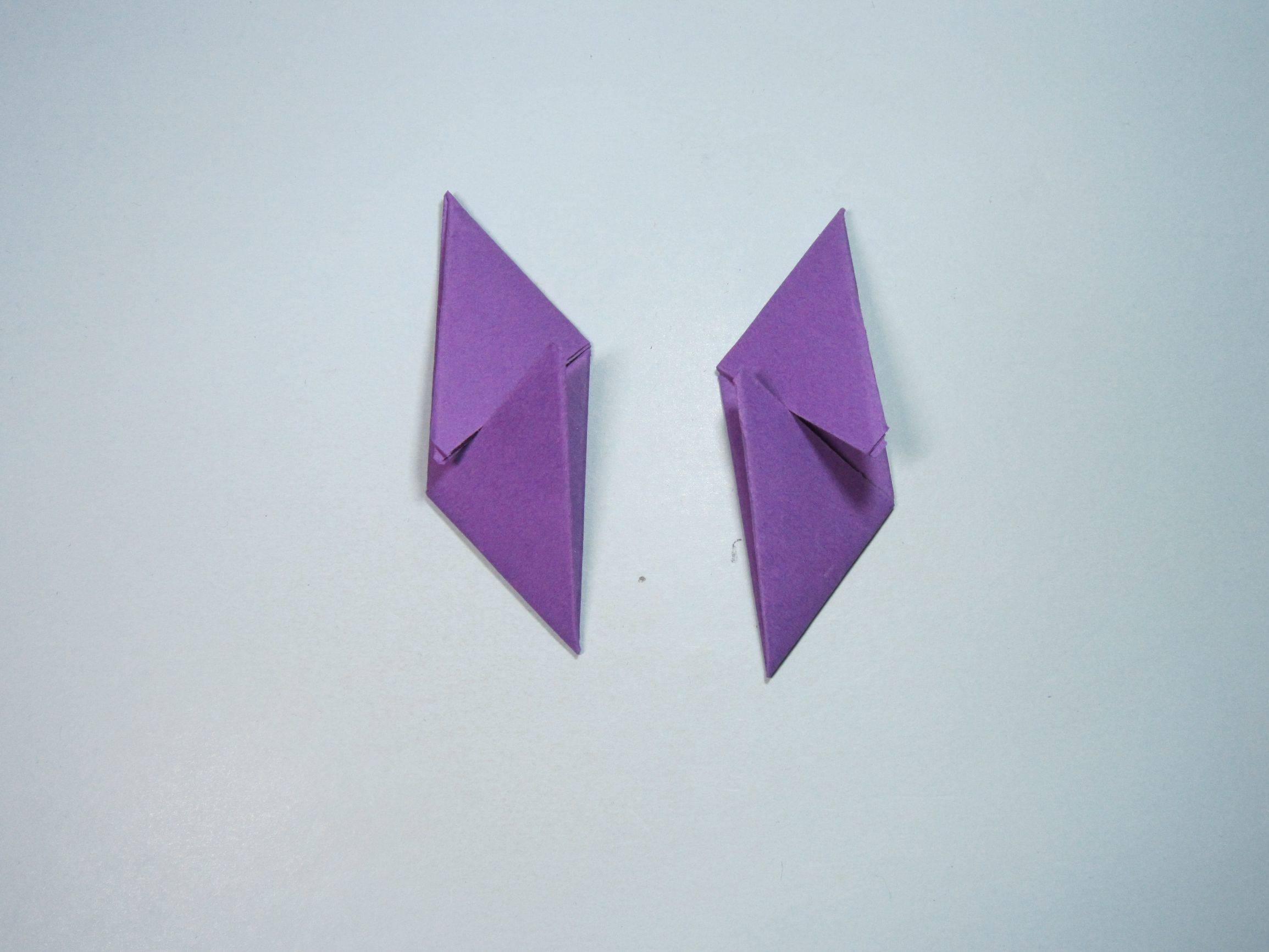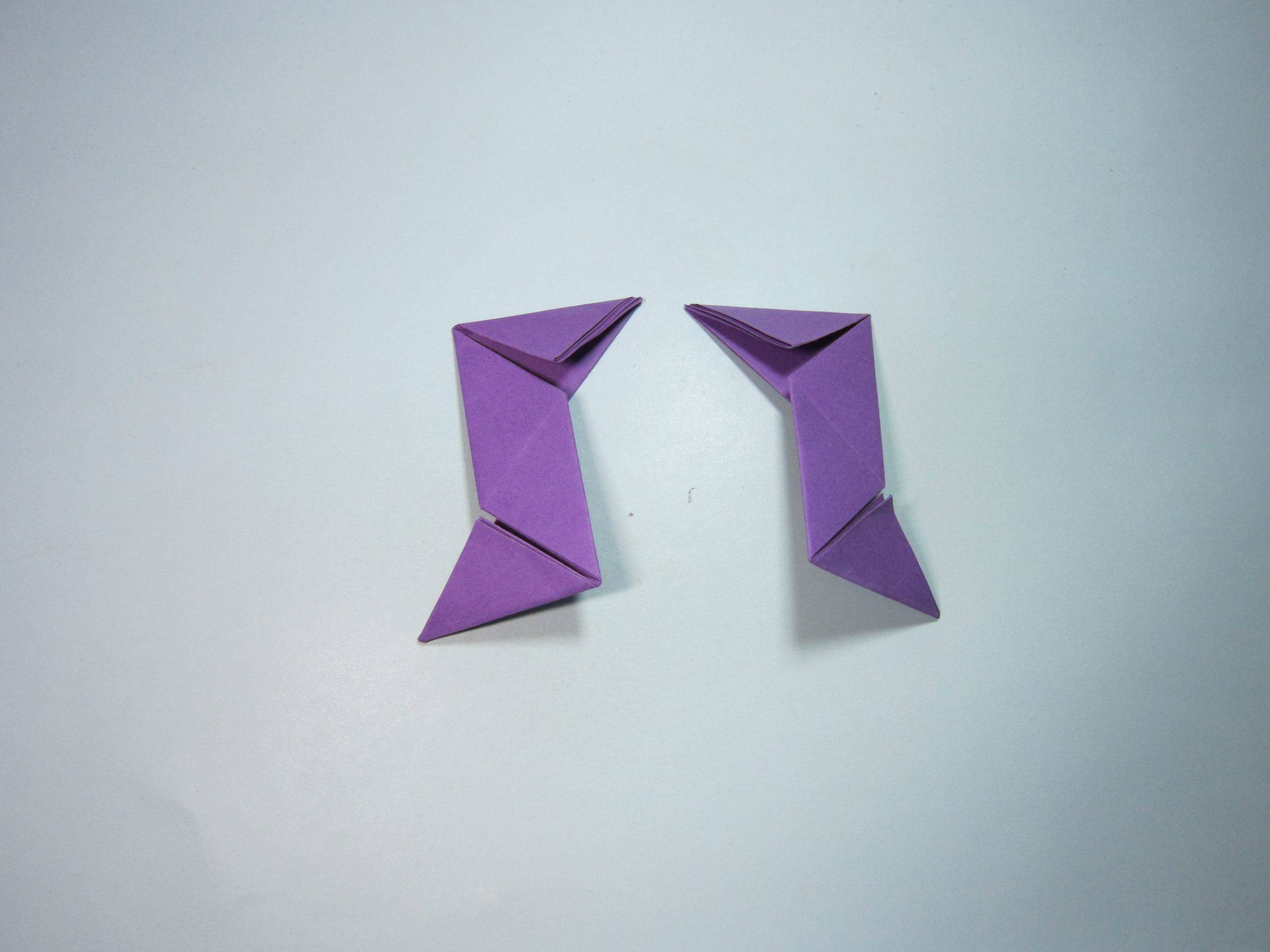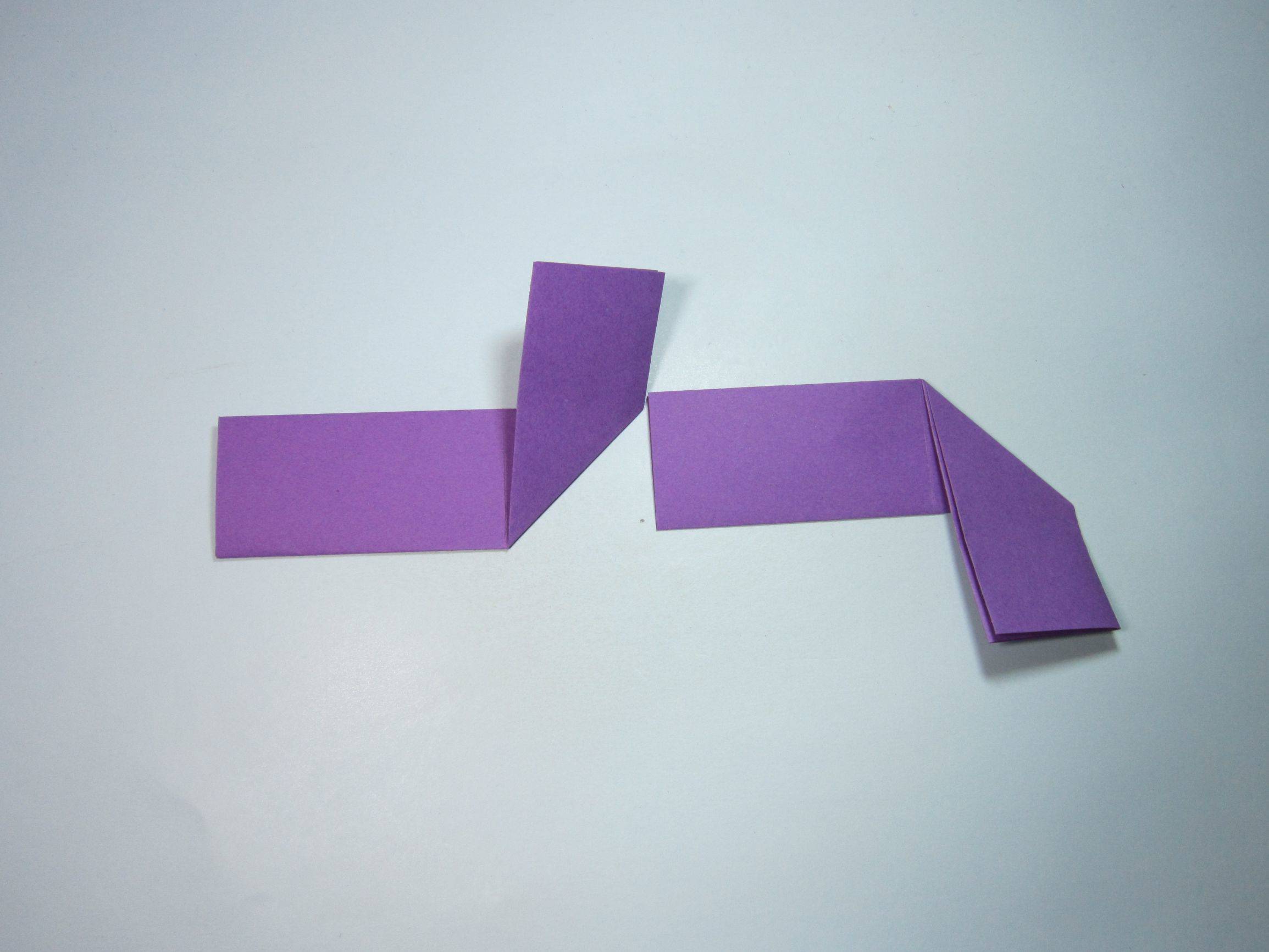 第6步、将两个部件都翻面,将上下两端像这样折成三角形,折的时候三角形不能折返了。