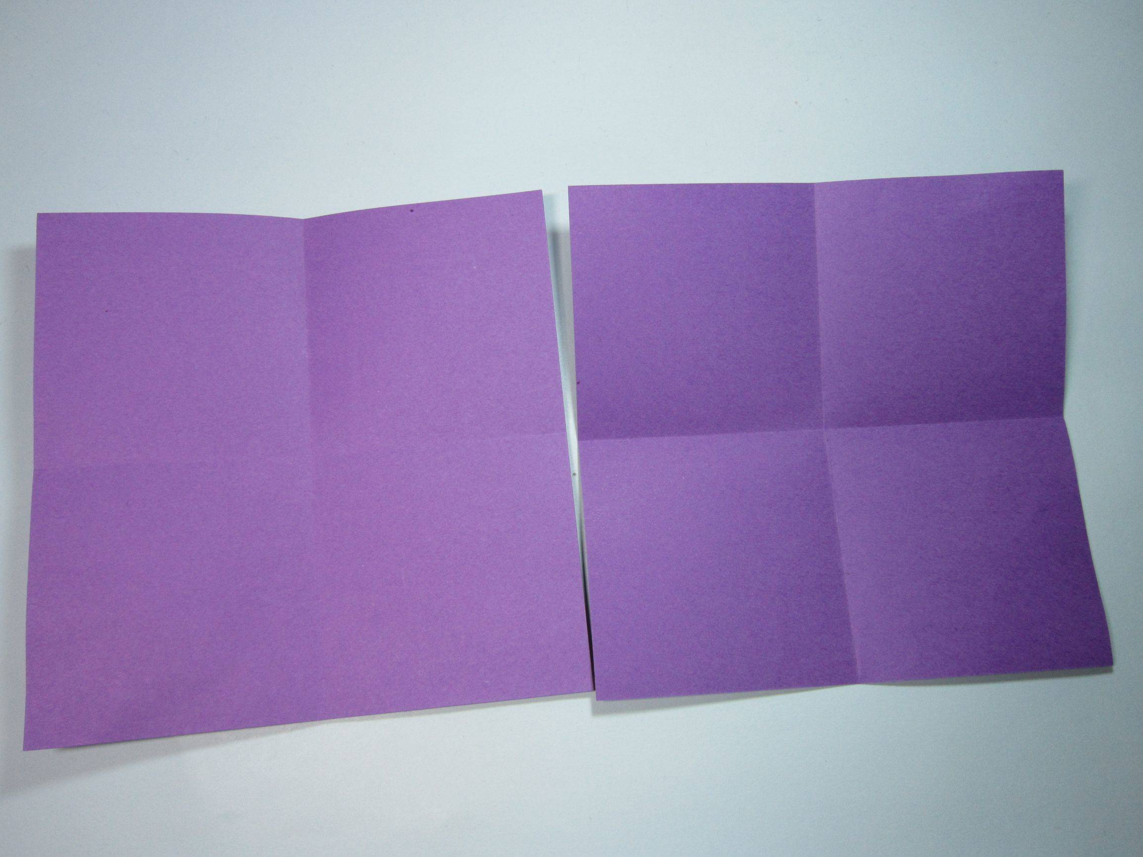 第1步、首先准备两张同等大小的正方形纸,将每张纸的四条边分别两两对折,然后再展开,留下折痕。