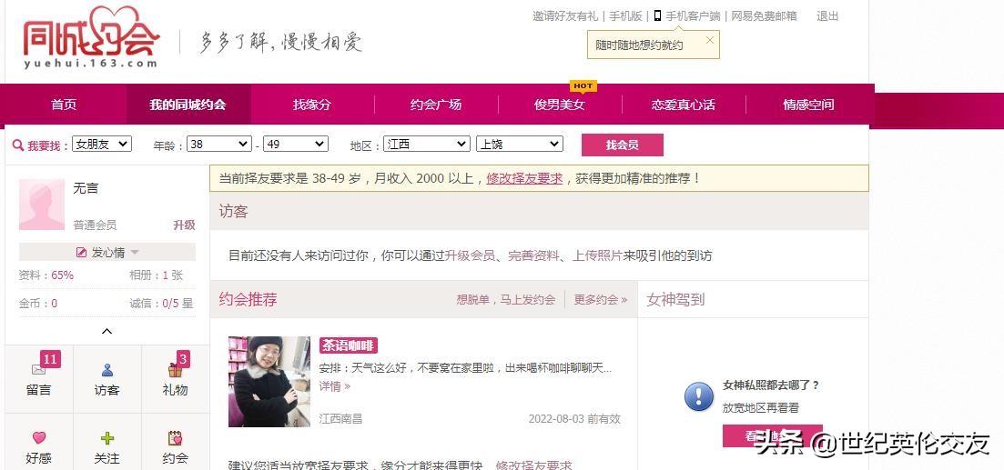 作为网易公司交友社区(网易v交友,网易非常男女,网易同城约会)三大品牌之一的网易同城约会是主要面向高素质,渴望爱情婚姻的单身人士精心打造的安全交友约会平台,旨在帮助会员通过网络结识新朋友,在约会中找到真爱。
