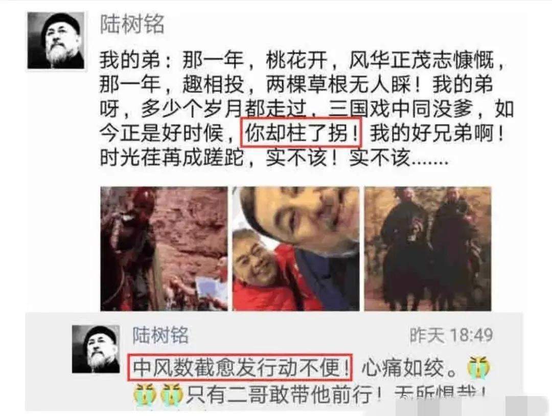 据悉,94年版的《三国演义》中张飞扮演者李靖飞脑中风,晚年无人照料,二哥陆树铭老师把他接进了自己办的养老院,但是陆树铭老师自己也没多少钱,为了治好三弟李靖飞,陆树铭老师多次演烂片、代言游戏、走穴等等。结果,二哥却走在了三弟前面。