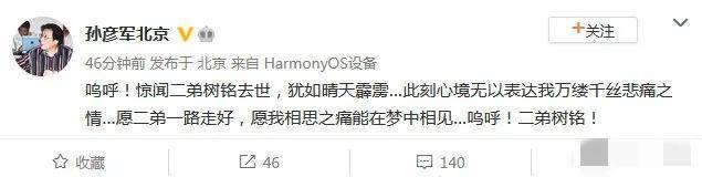 刘备扮演者孙彦军表示这件事发生得太突然,犹如晴天霹雳,内心悲痛不已,难以接受这个现实,愿二弟一路走好。