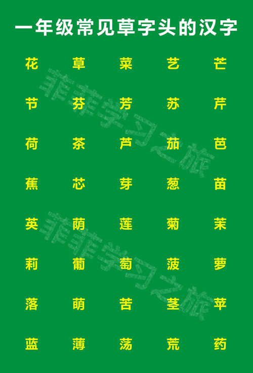 我们一年级常见的草字头的字比较多,需要我们掌握的有:花、草、菜、艺、芒、节、芬、芳、苏、芹、