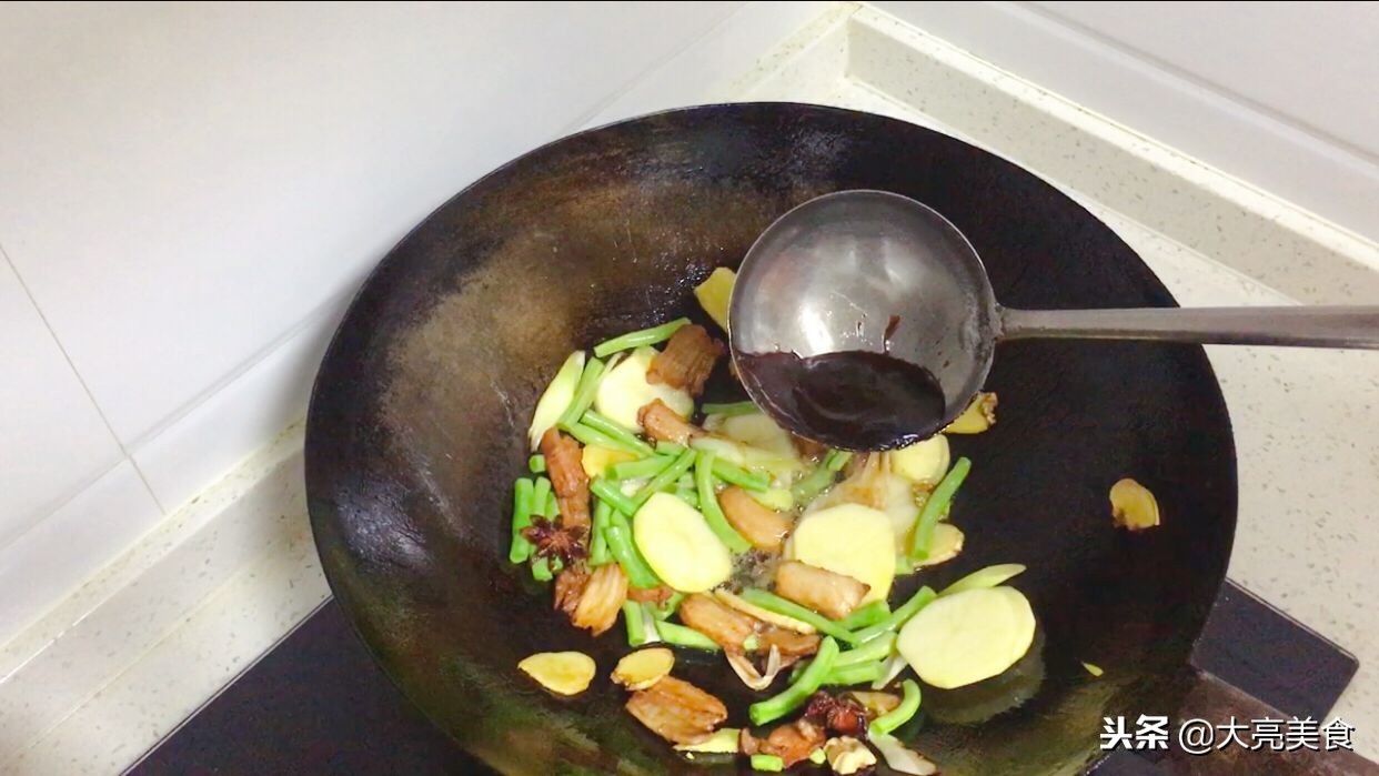炒出香味后,放入豆角,土豆炒一分钟左右,加入甜面酱炒出酱香味,老抽上色。